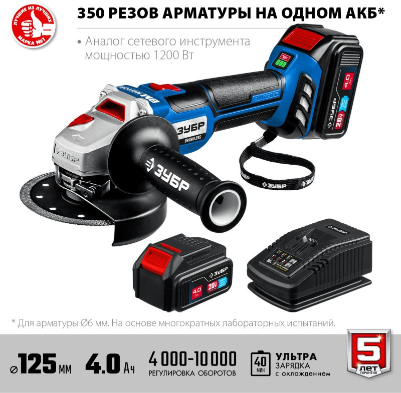 - Высокотехнологичная замена сетевой УШМ мощностью до 1200 Вт. Две мощные батареи емкостью 4 Ач и быстрая зарядка током 6А исключают простои. При меньшем, чем у сетевого аналога, весе данная модель обладает максимальной мобильностью, гораздо более удобной эргономикой, имеет все вспомогательные и защитные системы. Что в совокупности с бесщеточным двигателем с длительным ресурсом делает данную модель гораздо более выгодным выбором к приобретению