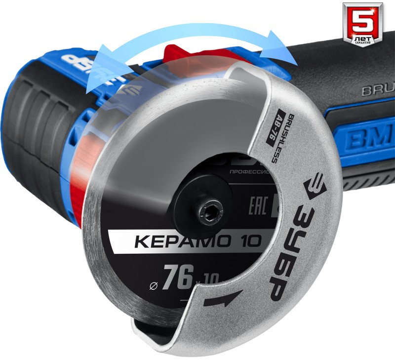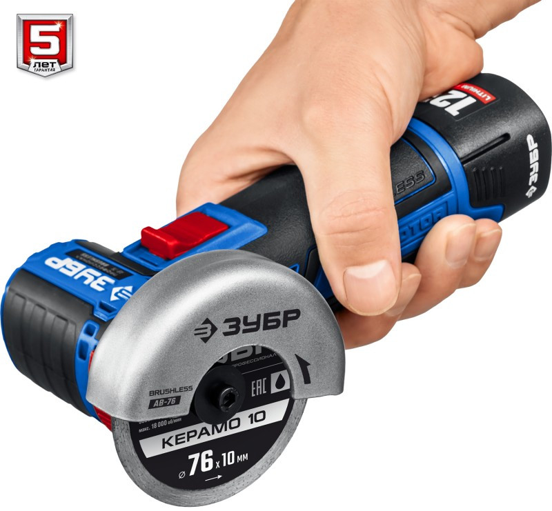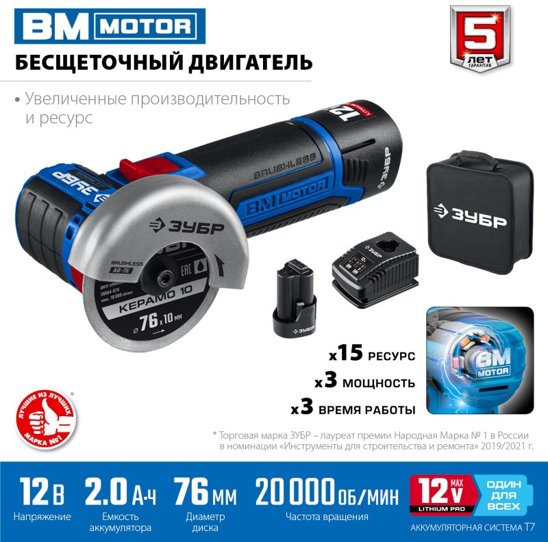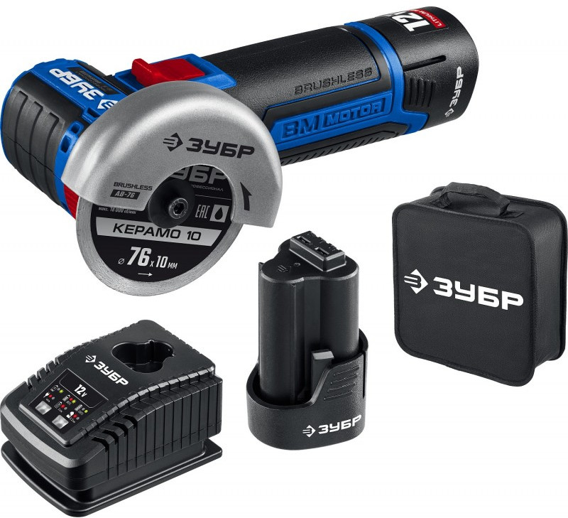 Бесщеточная УШМ Зубр Профессионал AB-76-22 12В, 2 АКБ (2Ач), в сумке
