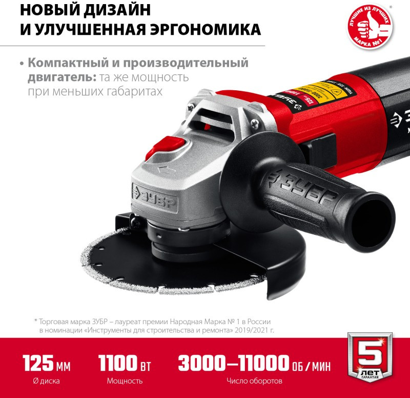 УШМ Зубр УШМ-125-1105 ЭТ 125 мм, 1100 Вт, с регулировкой оборотов, компакт