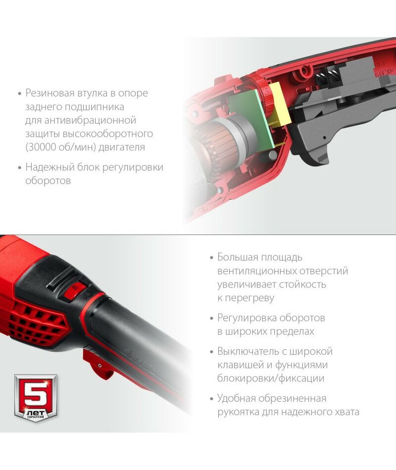 - Регулировка оборотов в диапазоне 3000-11000 об/мин для большей универсальности использования