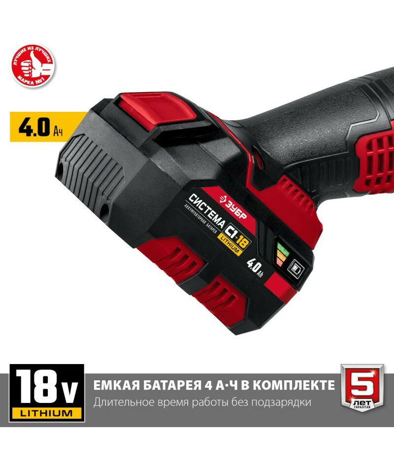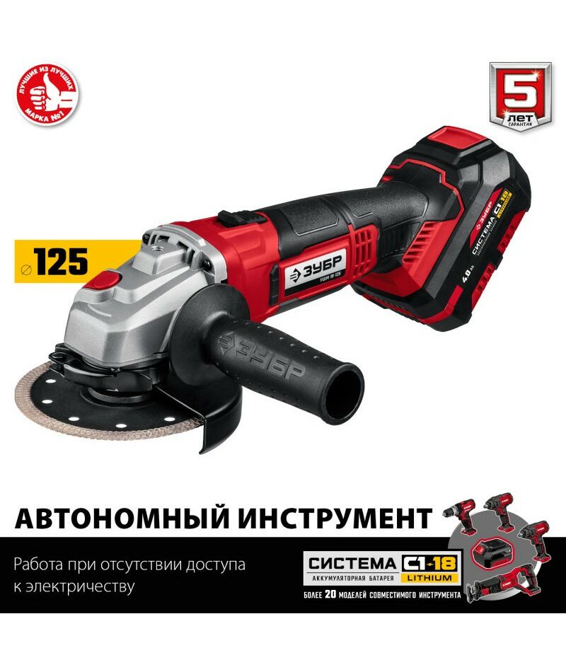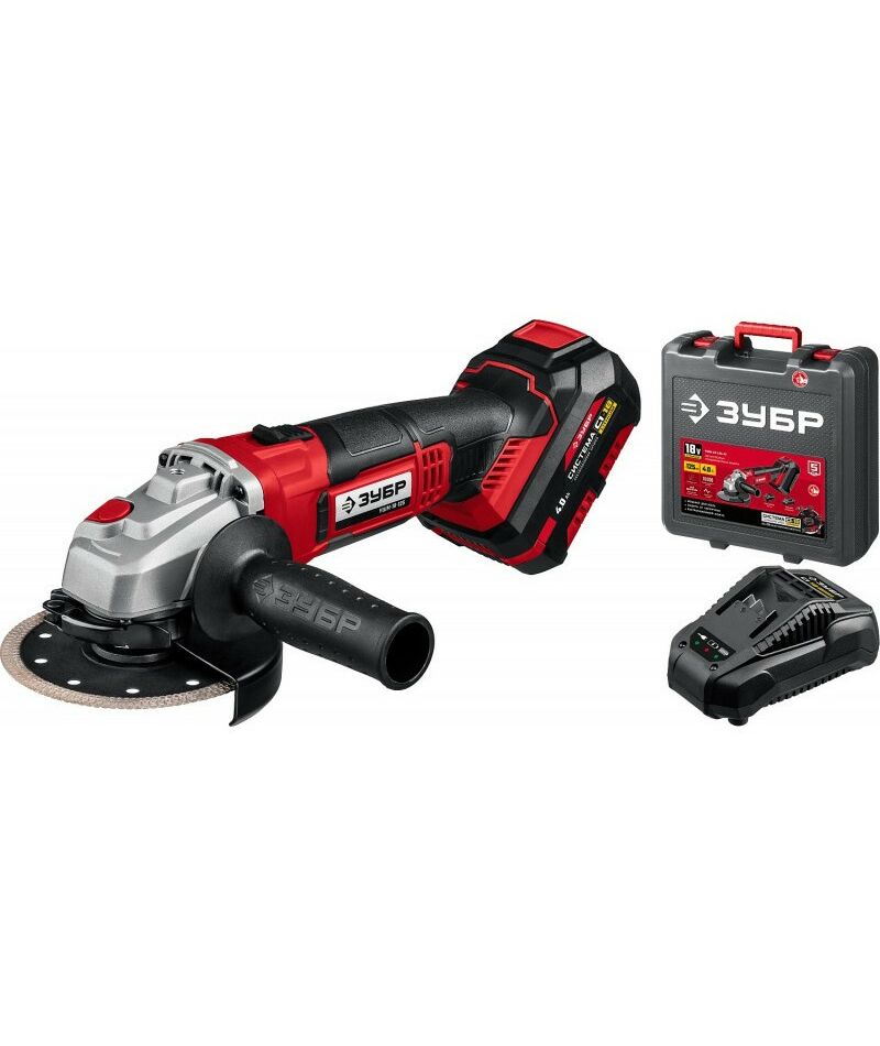 Аккумуляторная УШМ Зубр УШМ-18-125-41 18В, 1 АКБ (4Ач), в кейсе