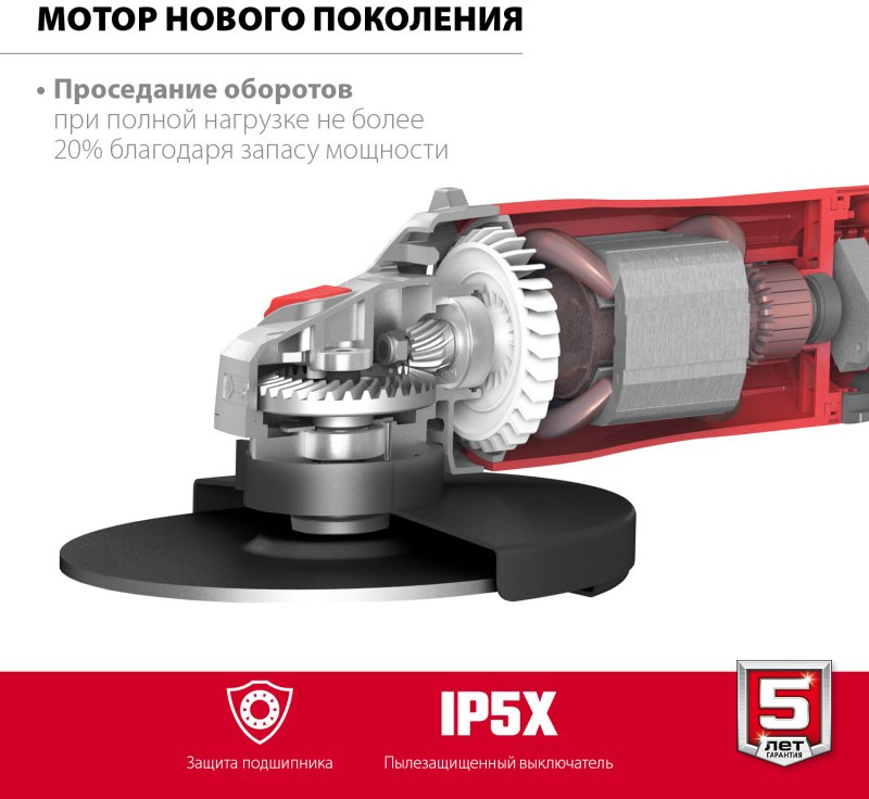 - Широкий эргономичный выключатель с пылезащитой, блокировкой непреднамеренного включения, а также фиксацией во включенном положении
