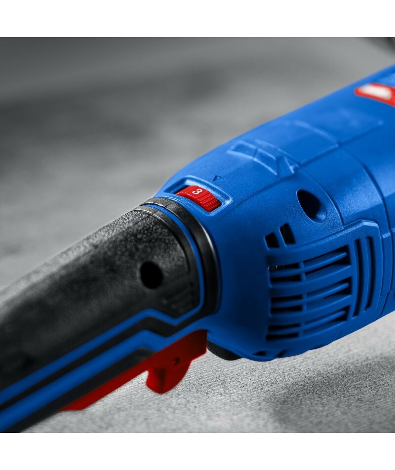 - Широкий эргономичный выключатель с пылезащитой, блокировкой непреднамеренного включения, а также фиксацией во включенном положении