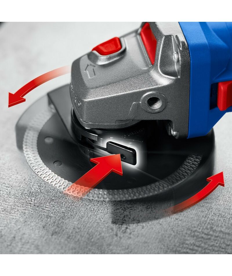 - защита - Kickback protection (защита от обратного удара) - эффективная защита оператора от рывка инструмента при резкой остановке диска (при заклинивании). Также предотвращает разрушение диска с разлетом осколков