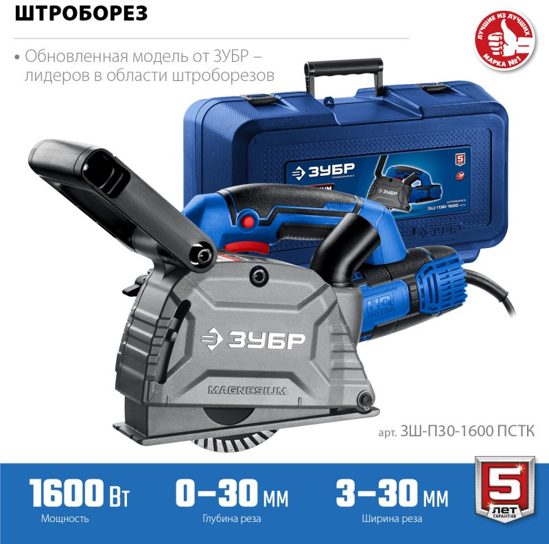 Профессиональный штроборез ЗУБР для выполнения штроб глубиной до 30 мм в легких бетонах. Расширенная (по сравнению с ЗШ-П30-1600 ПСТ) комплектация включает удобный кейс для хранения и переноски. Легкость и компактность позволяют длительно держать его на весу при работе на вертикальных поверхностях