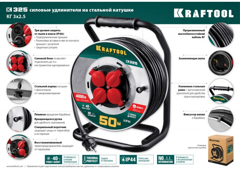 Силовой удлинитель на стальной катушке KRAFTOOL K-325 КГ 3х2.5 50м 4000Вт IP44 [55086-50]