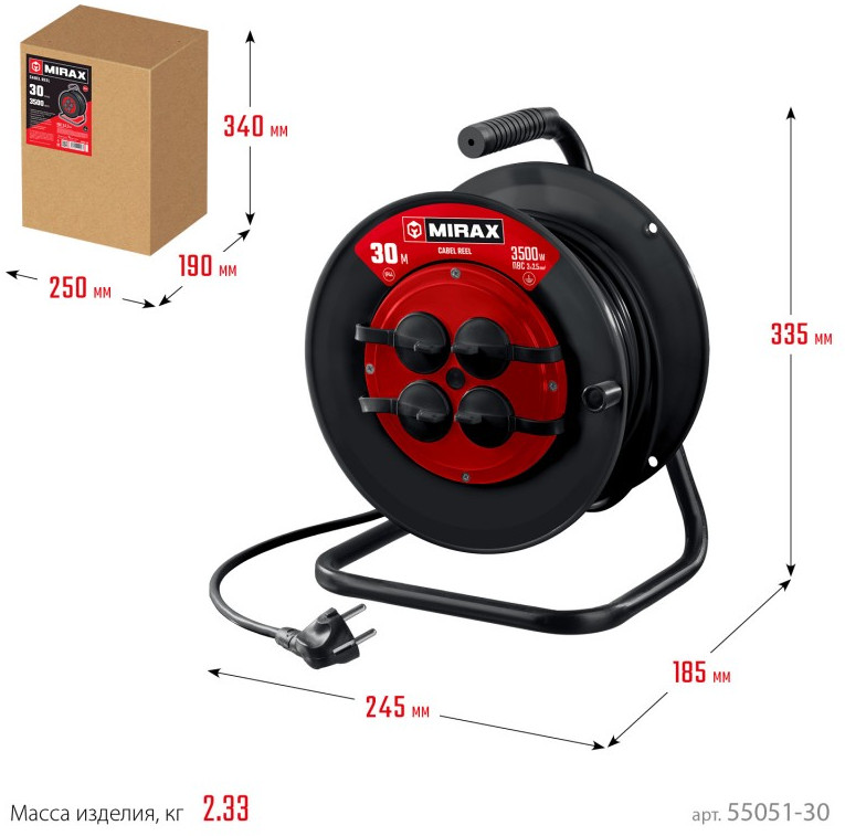 Силовой удлинитель на катушке MIRAX ПВС 3х2.5 30м 3500Вт IP44 [55051-30]