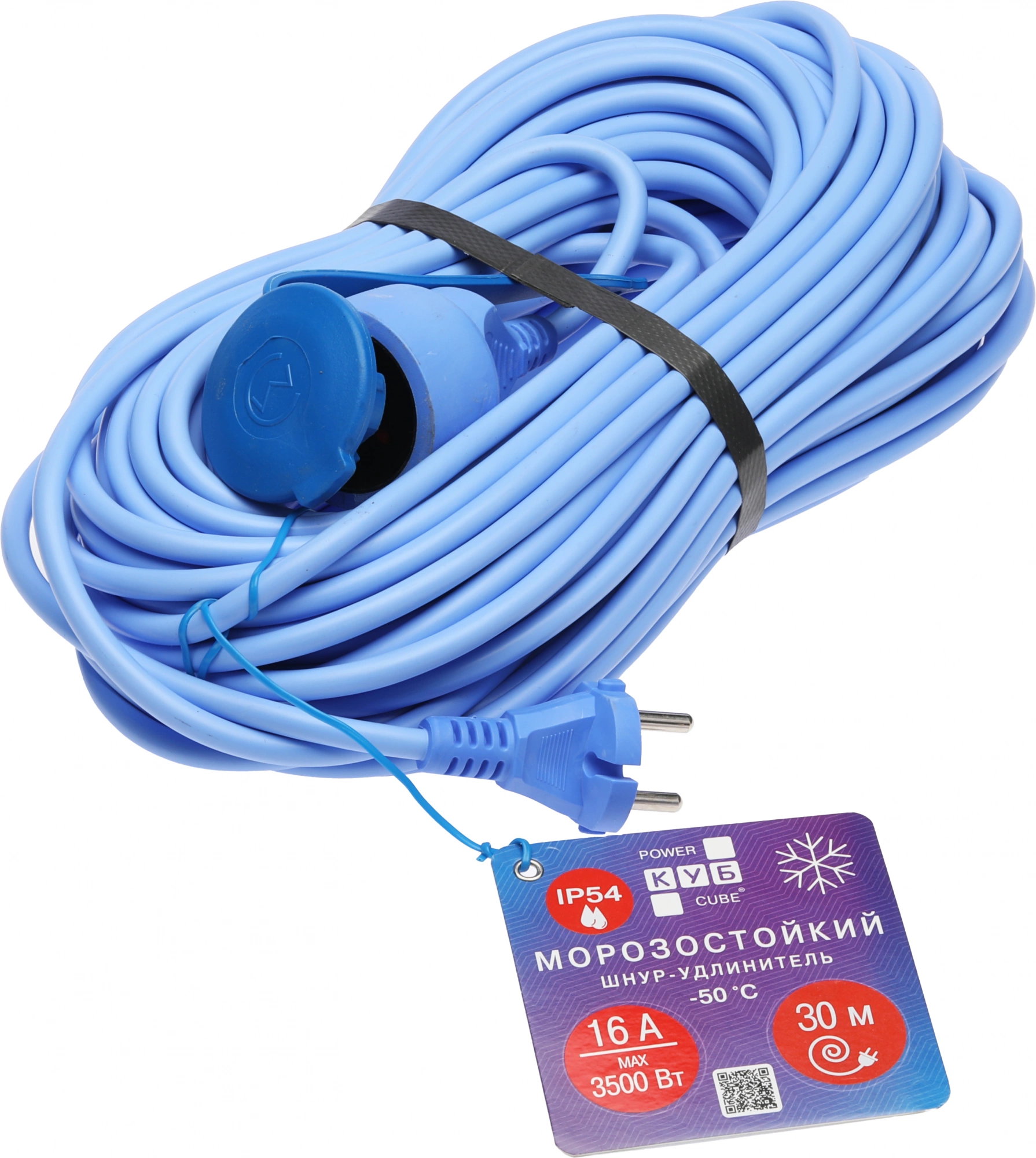 Морозостойкий силовой удлинитель в бухте. Кабель из термопластичного эластомера сохраняет гибкость и эластичность при температуре до -50 °С. Влагозащищённая розетка IP54.
