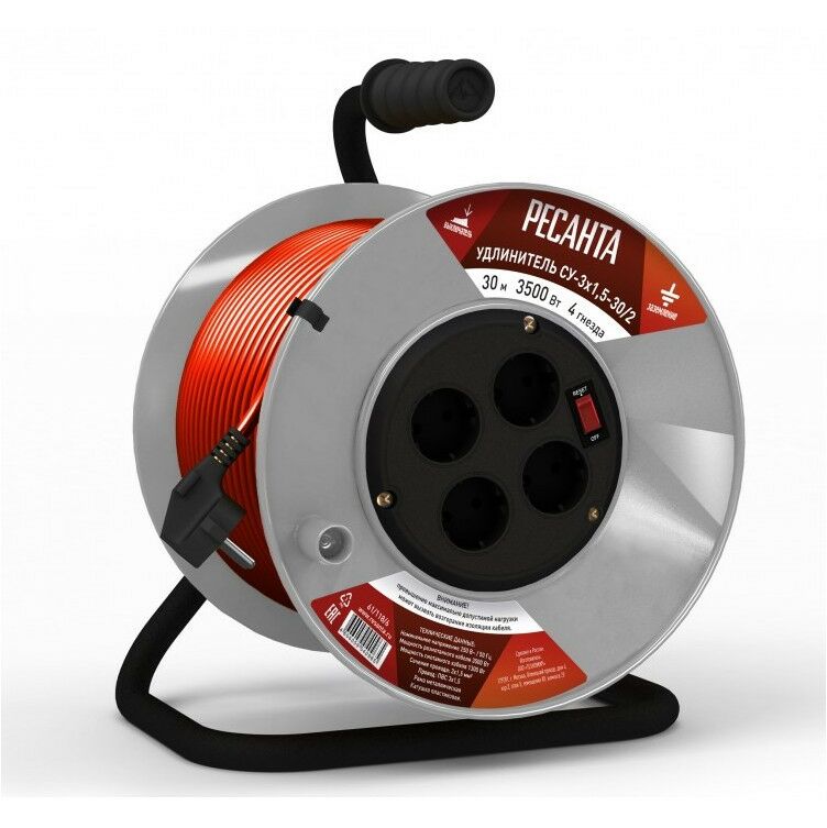 Удлинитель силовой на катушке РЕСАНТА СУ-3х1.5-30/2 30 м, ПВС, 3х1,5, 4 гнезда, пластиковая катушка, выключатель с тепловым реле [61/118/6]
