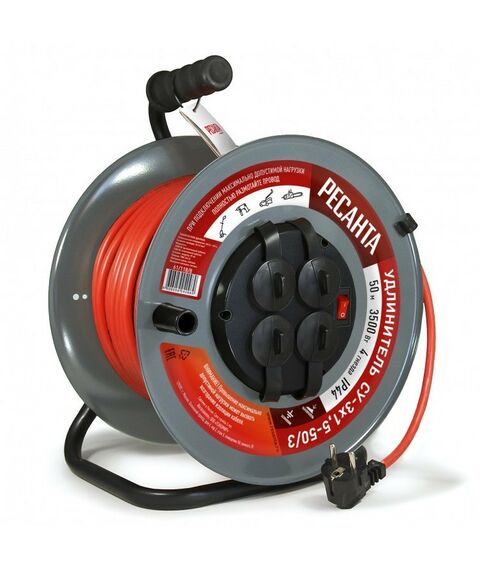 Удлинитель силовой на металлической катушке РЕСАНТА СУ-3х1.5-30/3 30 м, ПВС, 3х1.5, 4 гнезда, металлическая катушка, выключатель с тепловым реле [61/118/7]