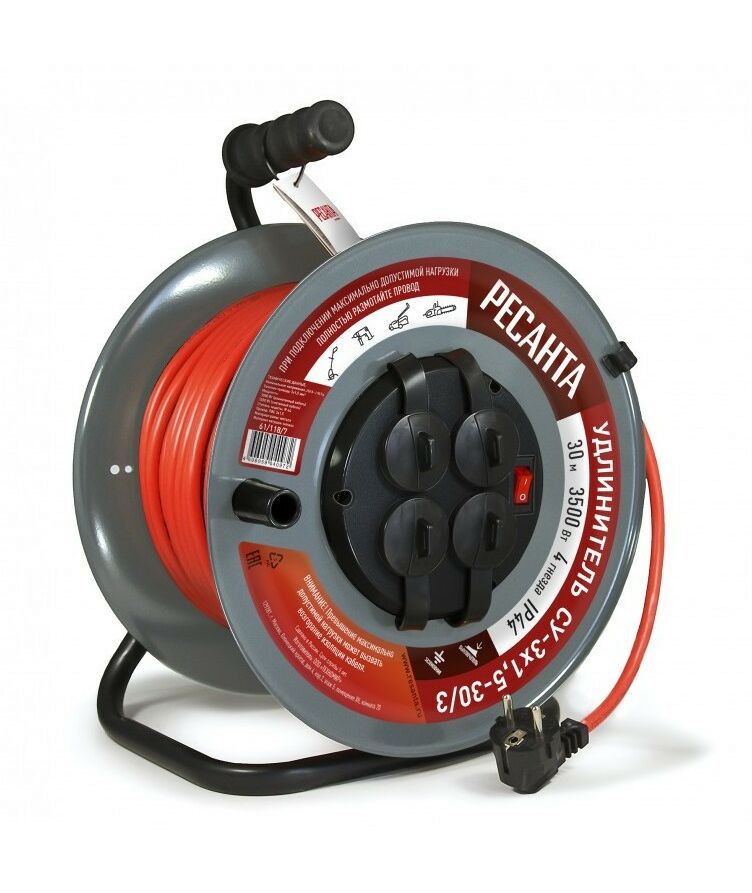 Удлинитель силовой на металлической катушке РЕСАНТА СУ-3х1.5-50/3 50 м, ПВС, 3х1.5, 4 гнезда, металлическая катушка, выключатель с тепловым реле [61/118/8]