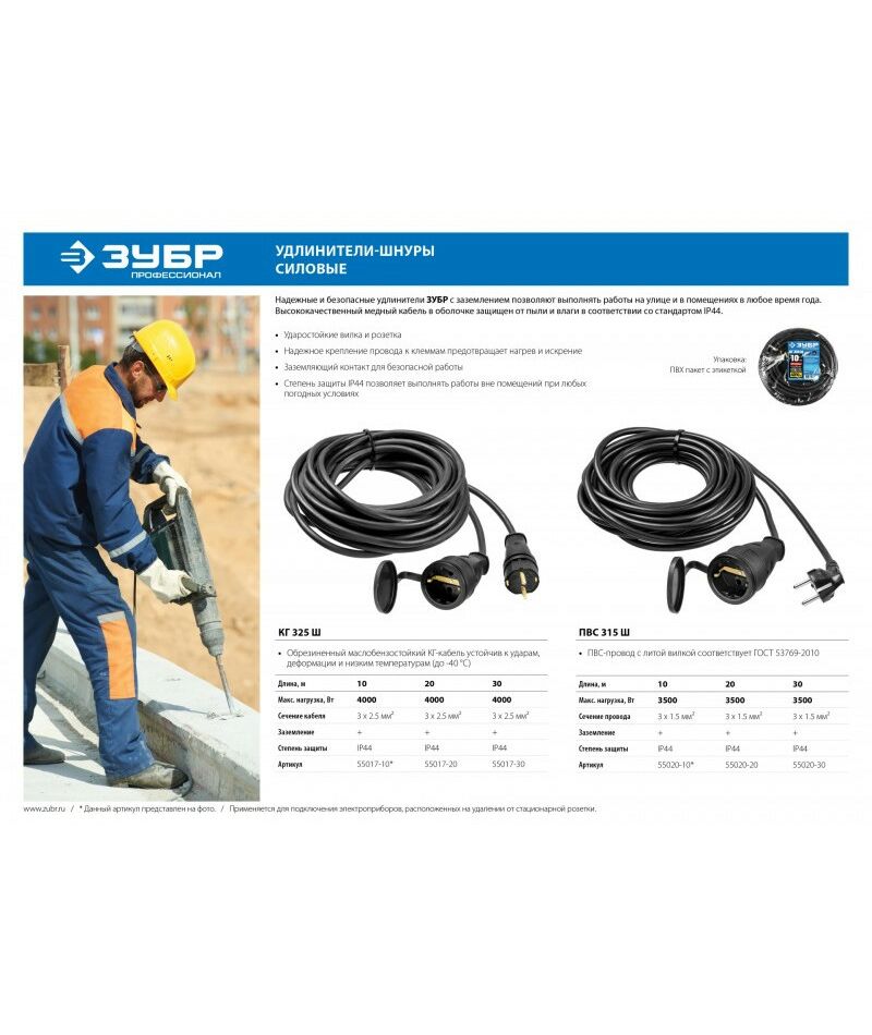 Силовой удлинитель-шнур Зубр Профессионал ПВС 315-Ш ПВС 3х1.5 30 м 3500Вт IP44 [55020-30]