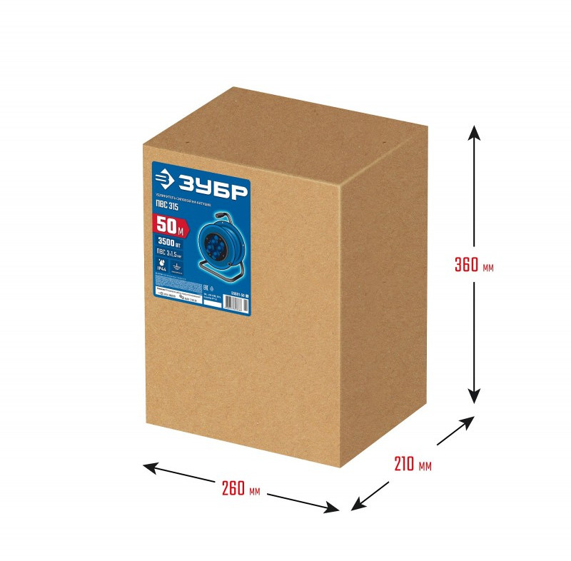 Силовой удлинитель на катушке Зубр Профессионал ПВС 315 ПВС, 3 x 1.5 мм2, 50 м, 3500 Вт, IP44 [55081-50]