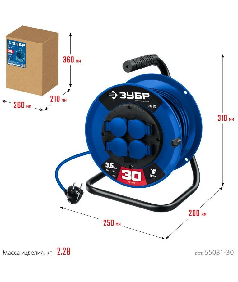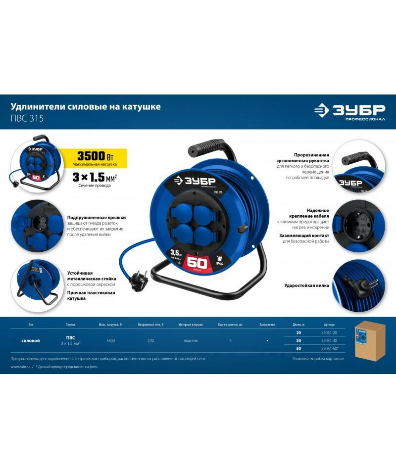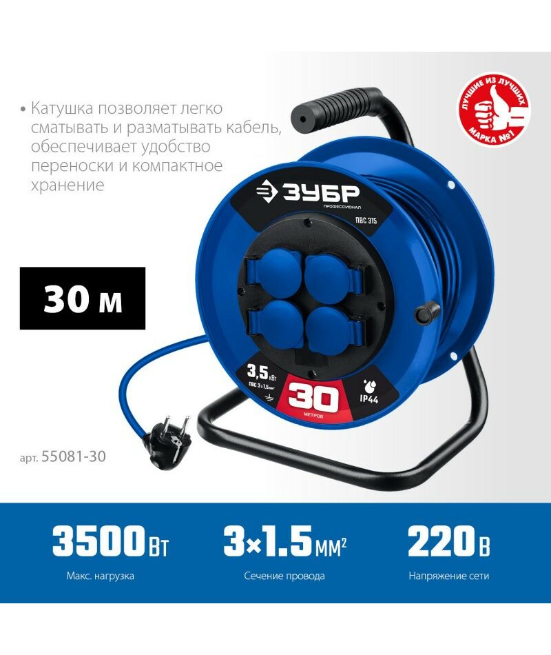 Силовой удлинитель на катушке Зубр ПВС 315 3х1.5 30м 3500Вт IP44 [55081-30]