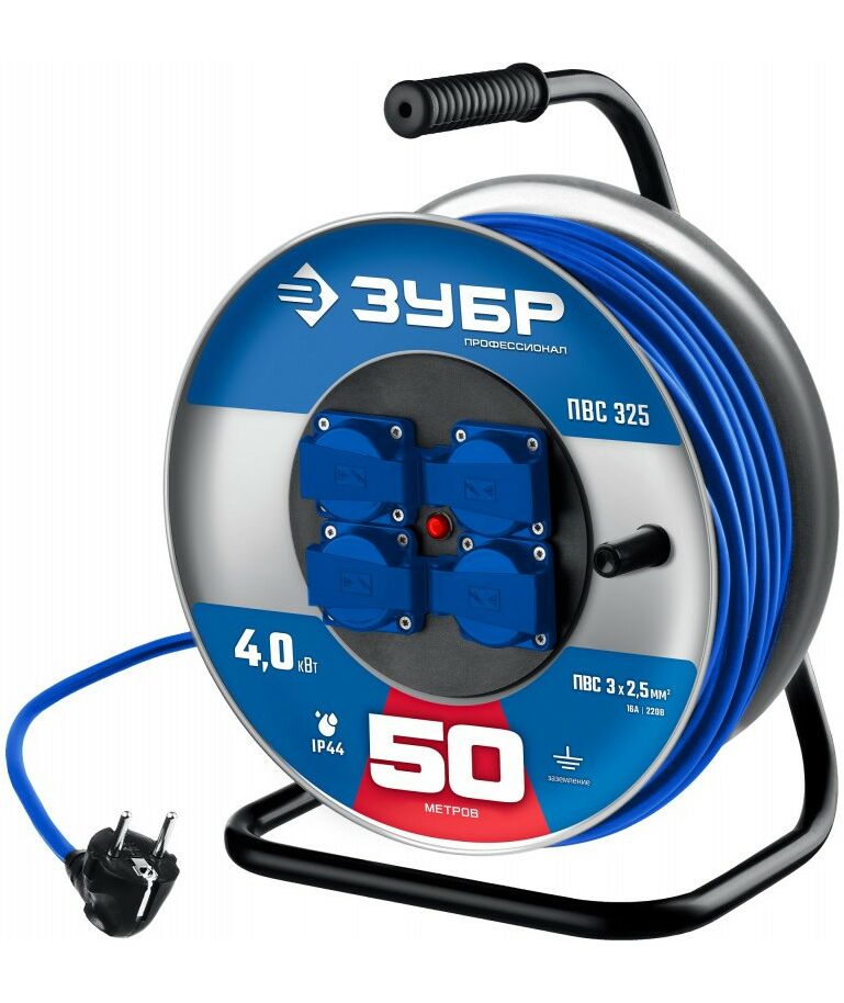 Силовой удлинитель на стальной катушке Зубр ПВС 325 ПВС 3х2.5 50м 4000Вт IP44 [55102-50]