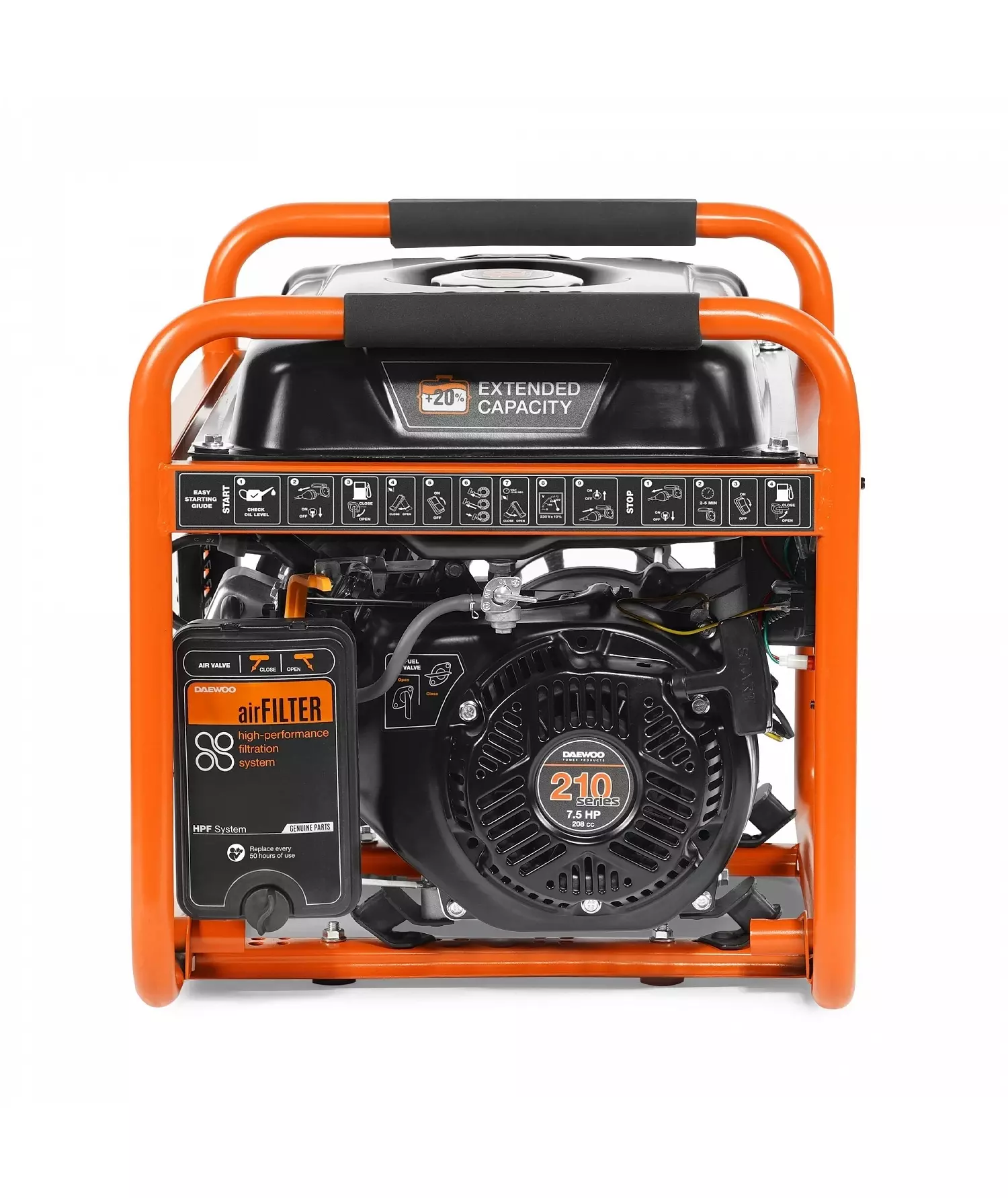 | Особенности | Профессиональный двигатель DAEWOO, увеличенный топливный бак 18 л, быстрый запуск, многофункциональный дисплей, AVR (Automatic Voltage Regulator), умная защита от перегрузок, датчик уровня масла, низкий уровень шума, прочная рама, 100% медный альтернатор, гарантия Daewoo |
