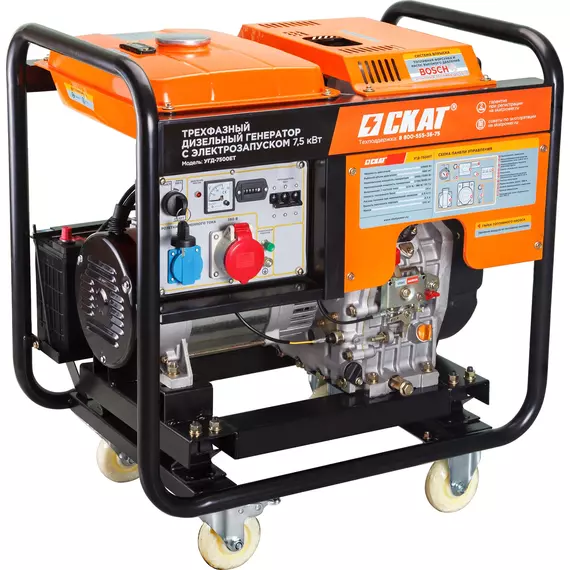 Трехфазный дизельный генератор УГД-7500ЕТ мощностью 7,5 кВт обеспечит энергией строительную площадку и станет отличным помощником для горнопромышленников, аварийных и монтажных бригад. Генератор универсальный: выдает как трехфазную мощность напряжением 380 В, так и однофазную, напряжением 220 В. Генератор уникальный тем, что выдает в режиме 220 В повышенную мощность 6,8 кВт для подключения оборудования высокой мощности: сварочные аппараты, компрессоры, насосы. Функция электрозапуска позволяет запускать генератор поворотом ключа.