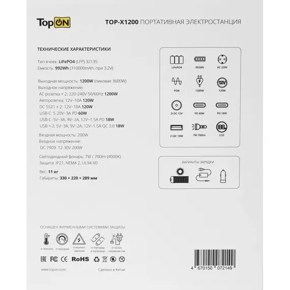 | Особенности | LiFePO4 ячейки суммарной емкостью 992Wh (310000mAh, при 3.2V). Выходная мощность 1200W, пиковая 3600W. 9 выходных интерфейсов для различной техники. 2 USB Type-C PD 60W/18W и 2 независимых USB QC 3.0 18W. Удобное и простое управление, цветной 5" LCD экран с подсветкой. |