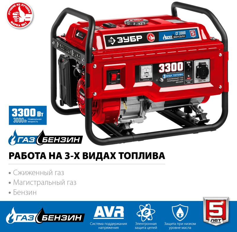 Бензиново-газовый генератор Зубр СГ-3300 3300 Вт