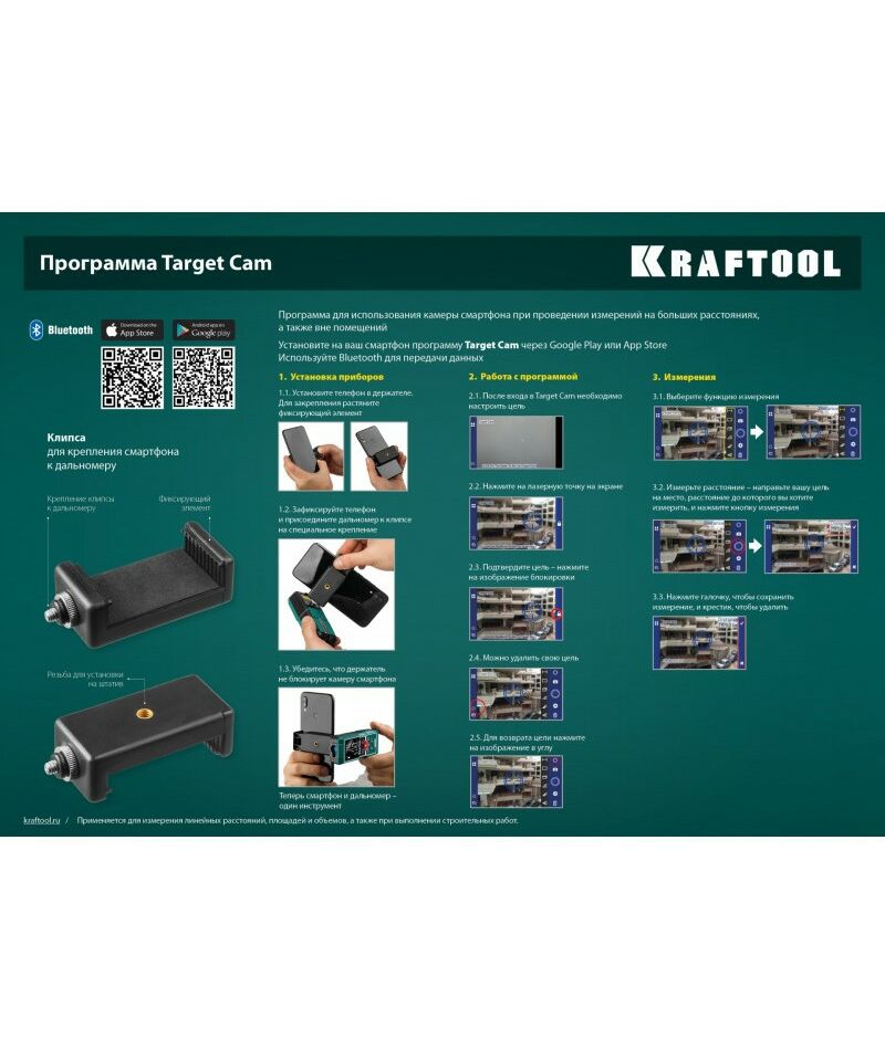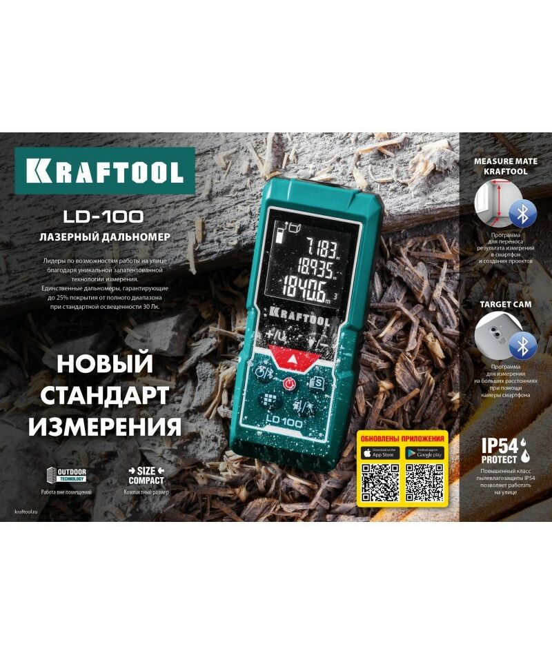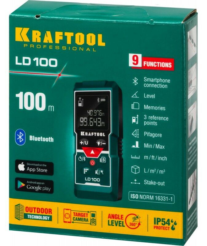 Профессиональный лазерный дальномер Kraftool - высокоточный прибор для быстрого и простого измерения линейных расстояний, площадей и объёмов. Позволяет проводить весь цикл измерений одному человеку, значительно ускоряя выполнение разметочных работ и повышая точность полученных данных.. Позволяет создавать дизайнерские проекты напрямую в вашем смартфоне. Возможность использования камеры смартфона в виде видоискателя.