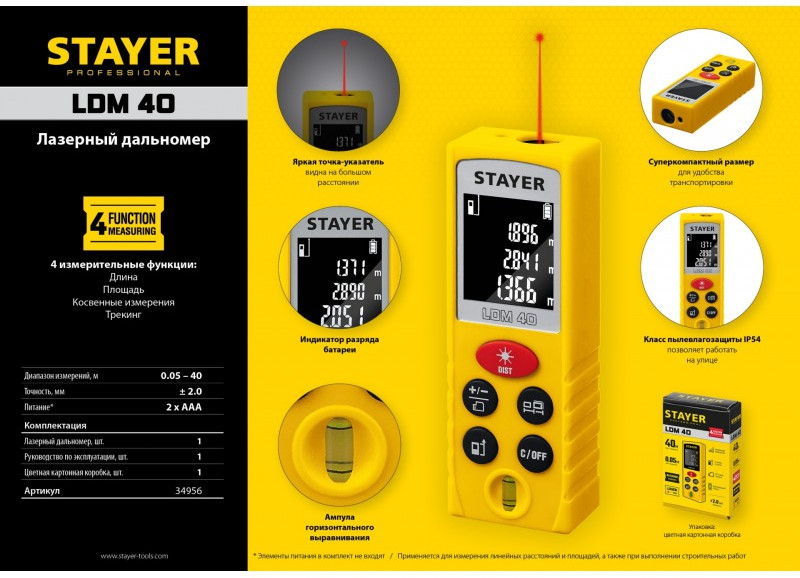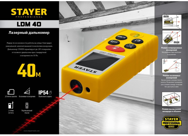 Лазерный дальномер STAYER Professional LDM-40 дальность 40 м, 5 функций [34956]