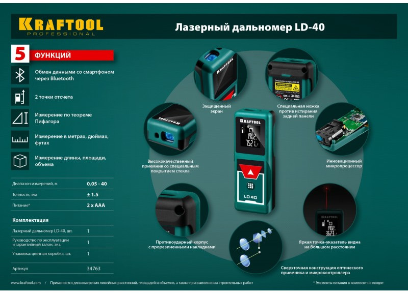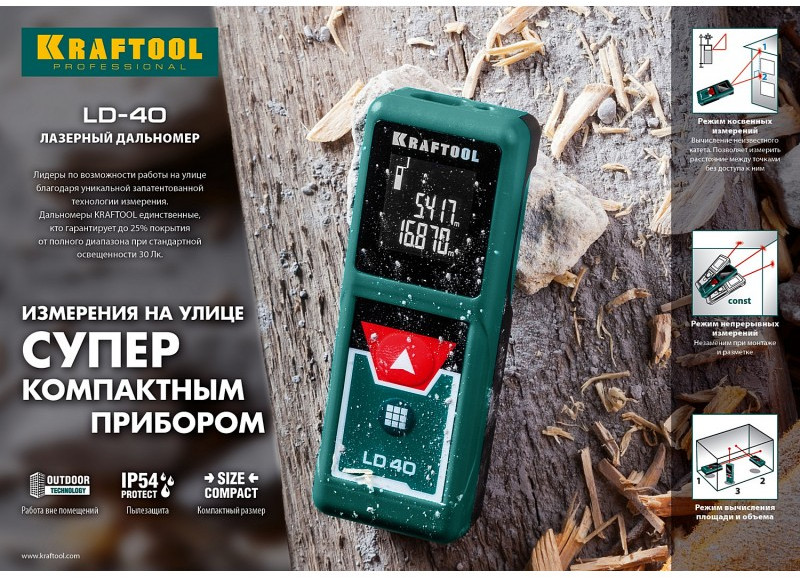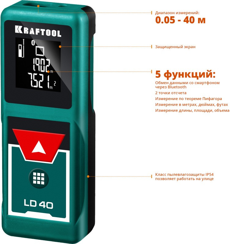 Профессиональный лазерный дальномер KRAFTOOL LD-40 дальность 5см - 40м, точность 1.5 мм [34763]