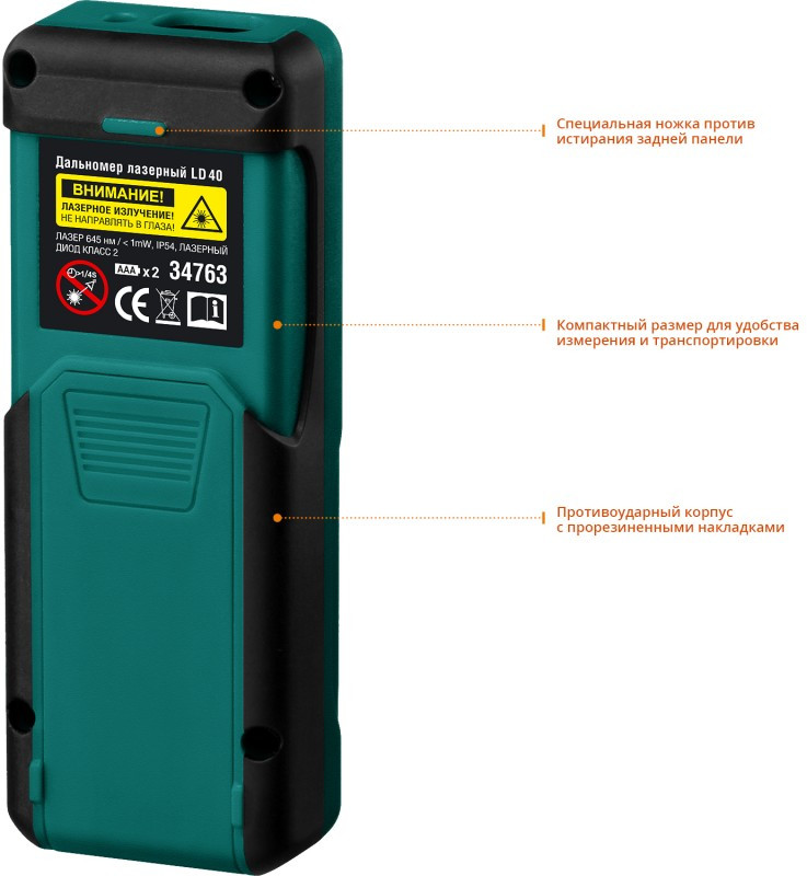 - Инновационная конструкция лазерного модуля и приёмника луча обеспечивает возможность проведения измерений на улице с возможностью надёжного покрытия до 50% от заявленного диапазона