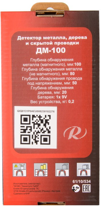 - Глубина обнаружения макс., мм: черные металлы - 100 цветные металлы (медная труба) - 80 медный кабель (под напряжением) - 50 древесина - 20