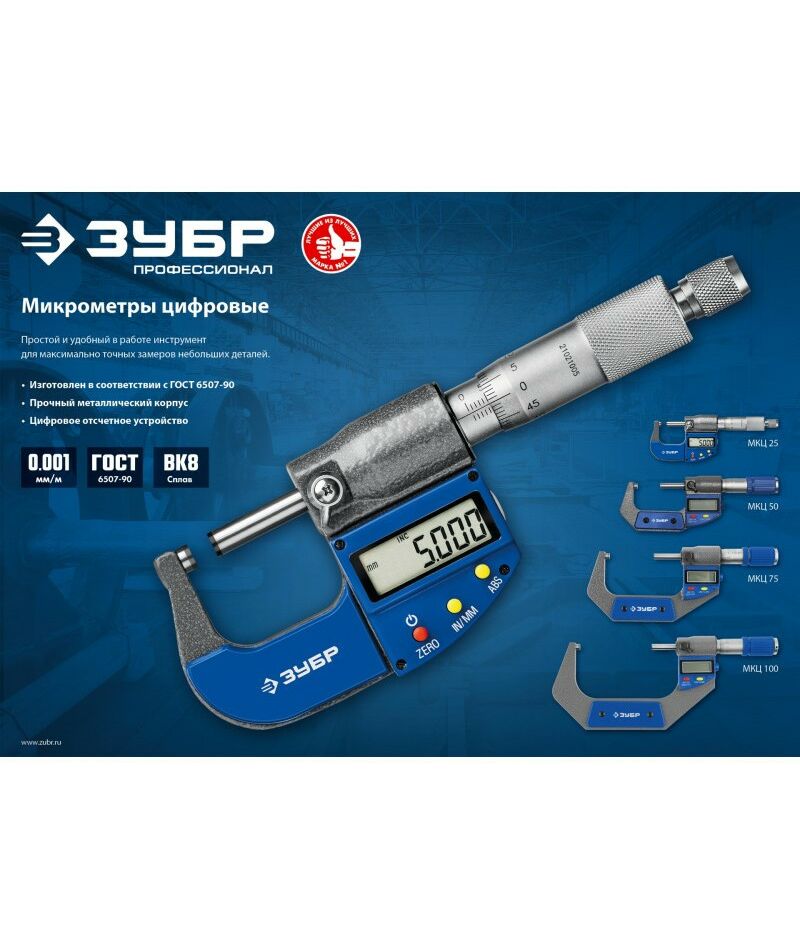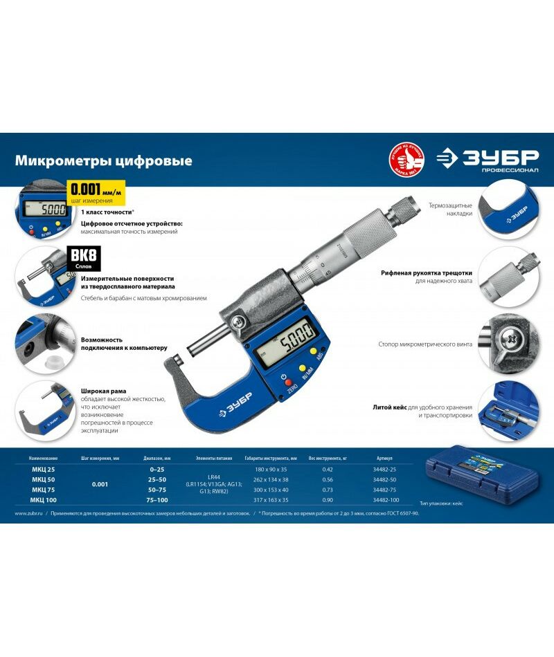 Микрометр гладкий цифровой Зубр ЭКСПЕРТ МКЦ 50 диапазон 25-50мм, шаг измерения 0,001мм [34482-50]