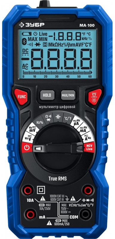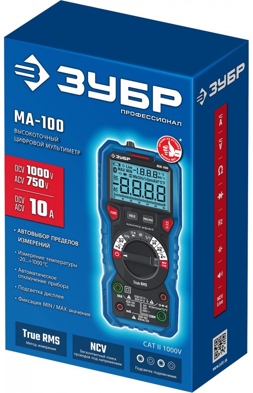 Профессиональный автоматический цифровой мультиметр ЗУБР обеспечивает высокую точность измерений. Применение высококачественных материалов формирует длительный срок службы. Прибор имеет функции измерения переменного и постоянного напряжения, сопротивления, емкости, проверки целостности цепей со звуковым сигналом, проверки диодов, измерения переменного и постоянного тока, измерение частоты до 10 МГц, измерение температуры и режим поиска проводки под напряжением NCV Live.