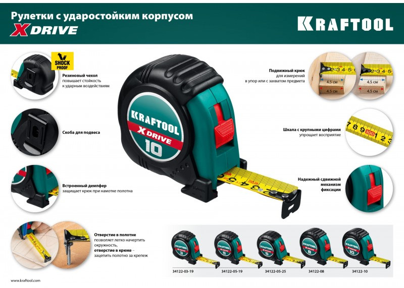 Рулетка с ударостойким обрезиненным корпусом KRAFTOOL X-Drive 10м / 25мм [34122-10]