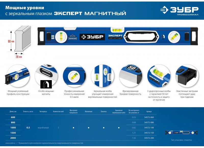 Мощный магнитный уровень Зубр Эксперт-М 2000 мм с рукоятками и зеркальным глазком [34572-200]