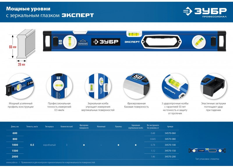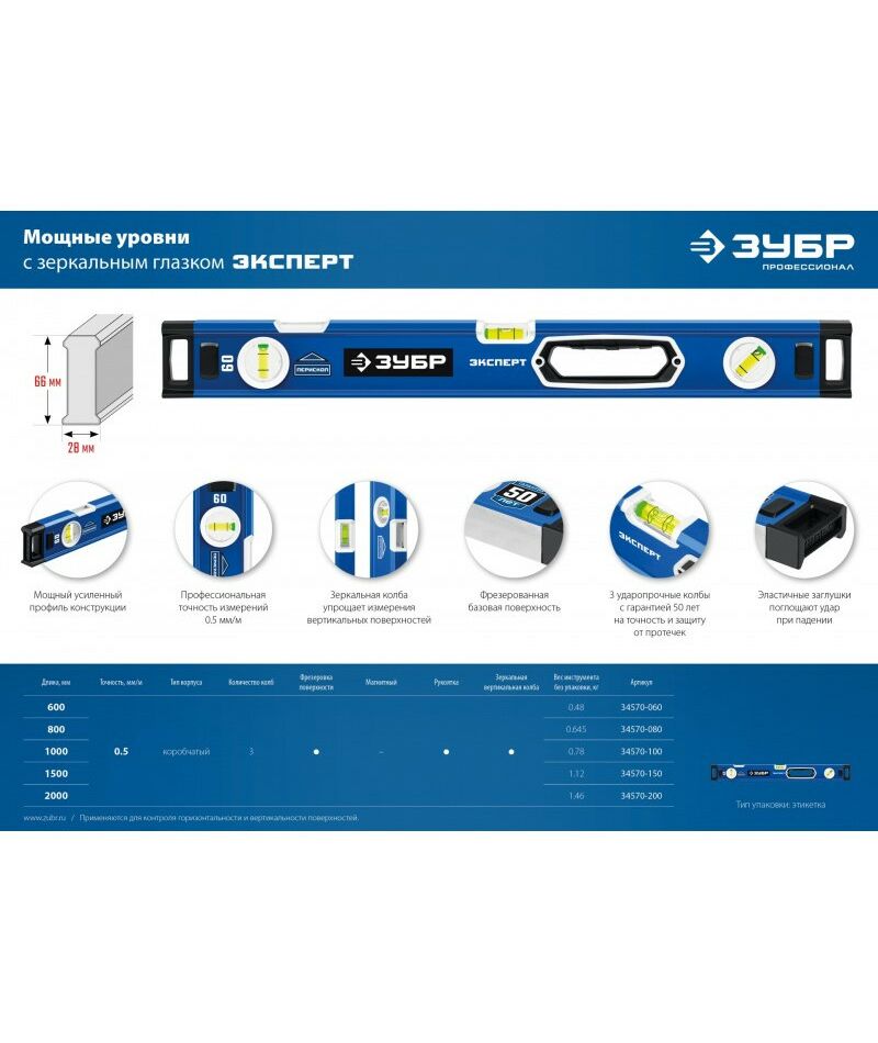 Мощный уровень Зубр Эксперт 2000 мм с рукоятками и зеркальным глазком [34570-200]