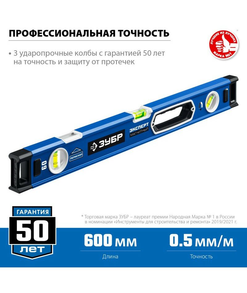 Мощный магнитный уровень Зубр Профессионал ЭКСПЕРТ-М, 600 мм с зеркальным глазком [34572-060]