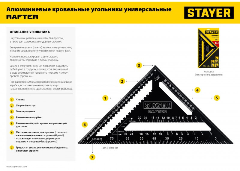 Универсальный кровельный угольник инструмент для точного определения расстояния в диапазоне от 0 до 300 мм. Может применяться в качестве торцовочного угольника, транспортира, рейсмуса и направляющей для пилы.