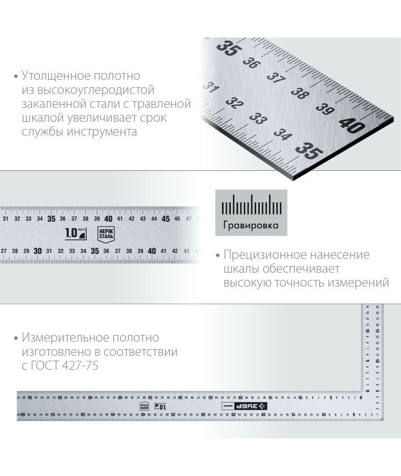 - Утолщённое полотно из высокоуглеродистой закалённой стали о с травлёной шкалой увеличивает срок службы инструмента.