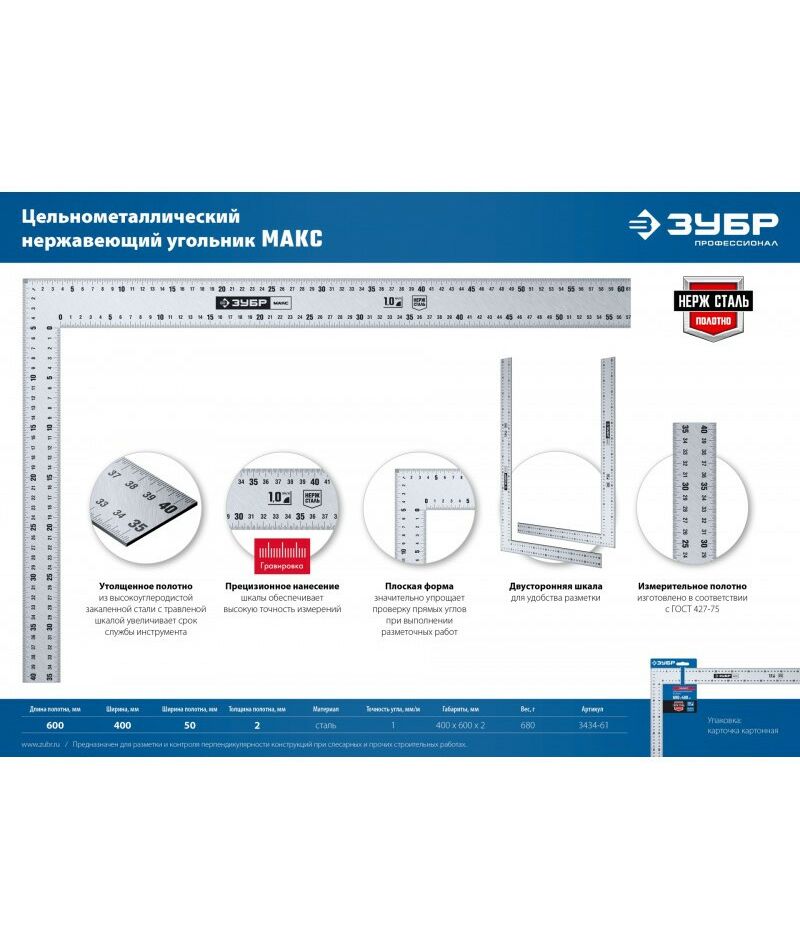 Нержавеющий плотницкий угольник Зубр Профессионал УПН-60 600 х 400 мм [3434-61]