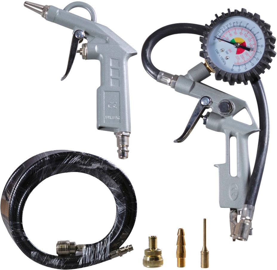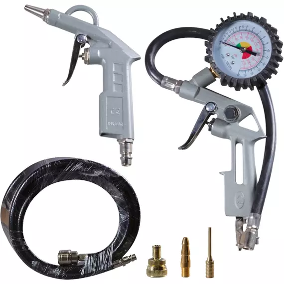 | Комплектация | Безмасляный коаксиальный компрессор, пневмопистолет для продувки, пневмопистолет с манометром для накачки, набор насадок для накачки (3 штуки), воздушный шланг 5 м. |