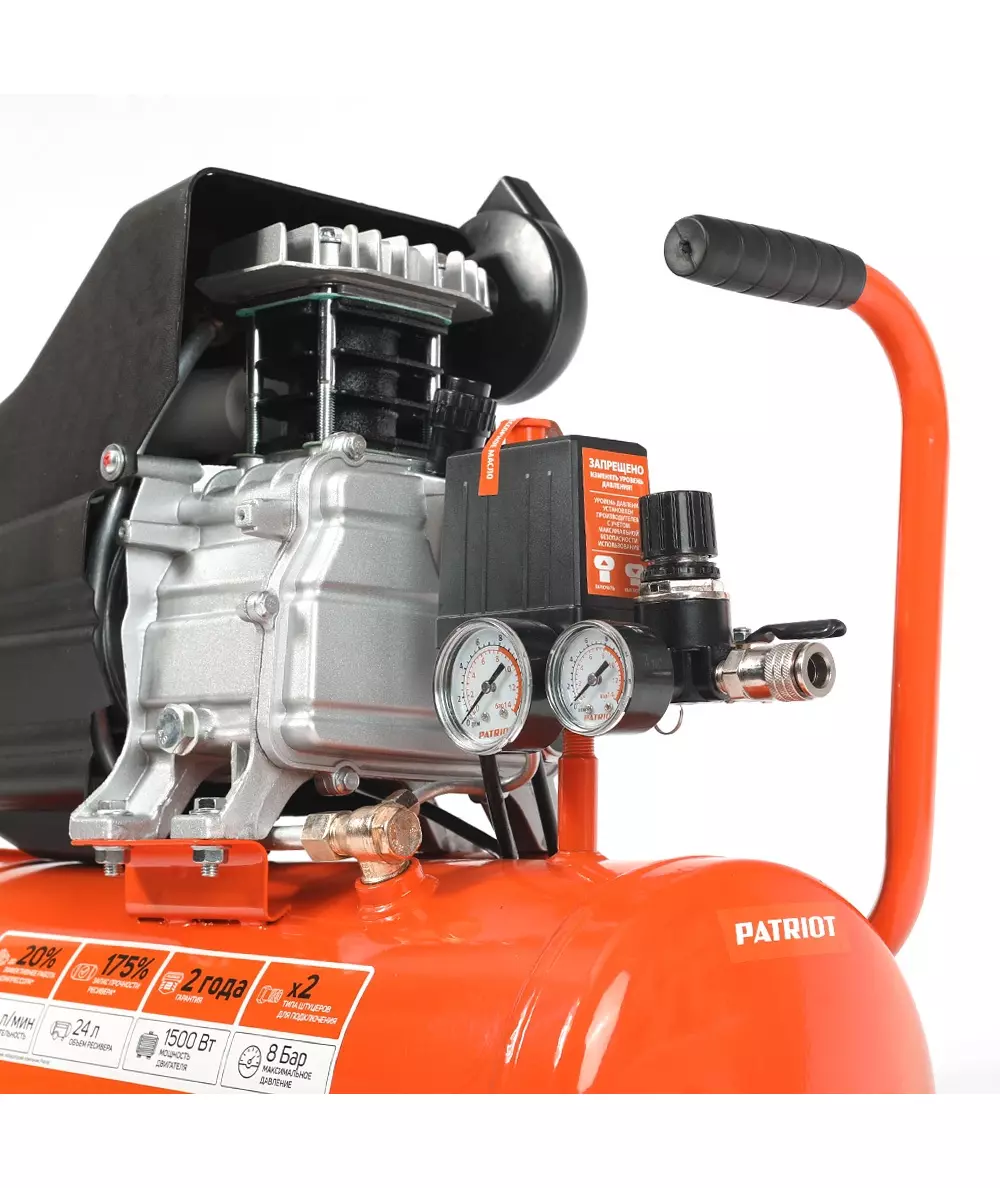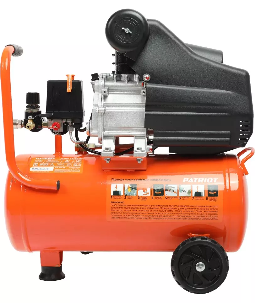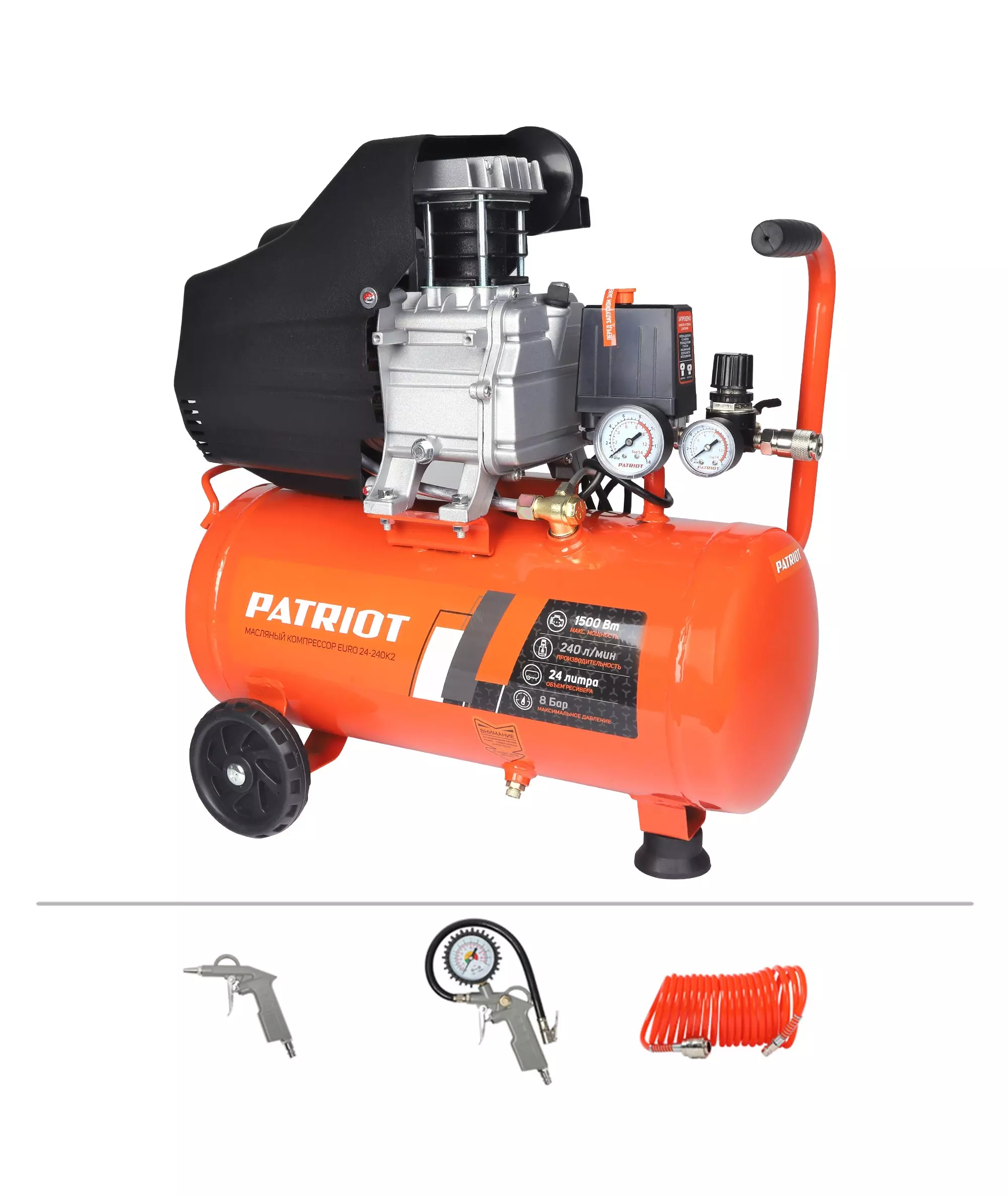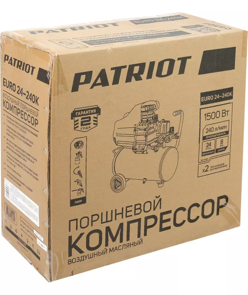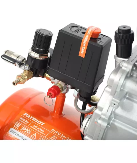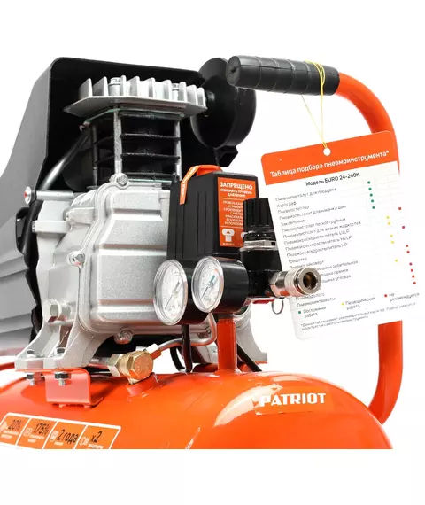 Компрессор Patriot поршневой масляный EURO 24-240K2, 240 л/мин, 8 бар, 1500 Вт, 24 л, быстросъемный 1/4" + "елочка", набор пневмоинструмента KIT 5C