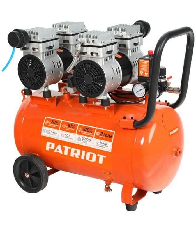 - Поршневой безмасляный компрессор PATRIOT WO 50-300 525301925 готов к работе сразу после покупки, не требует заправки маслом, а так же контроля за наличием масла и его замены