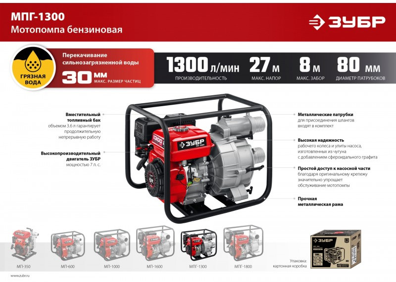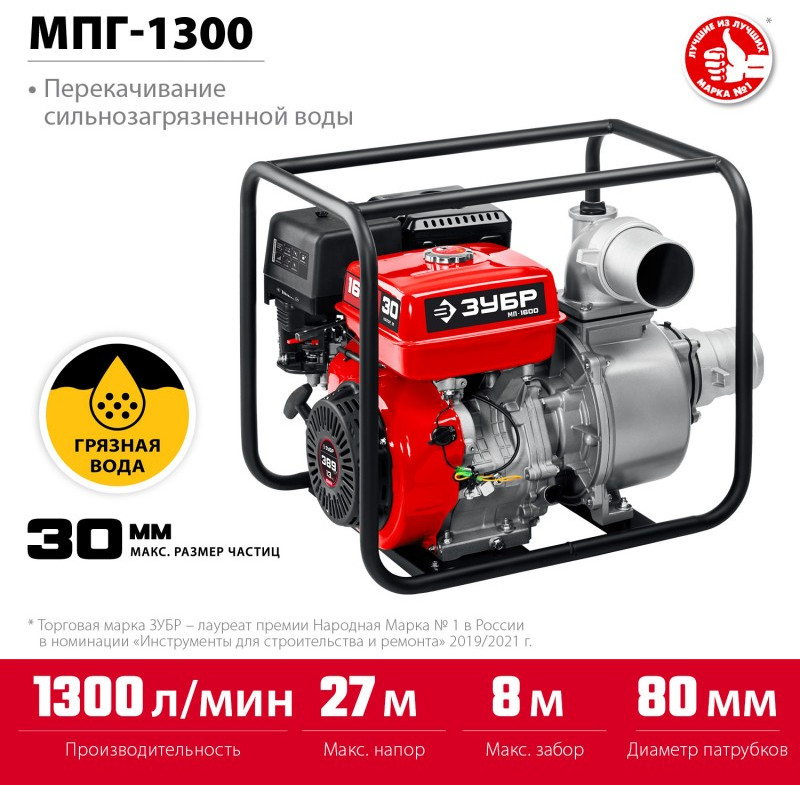 Мотопомпа бензиновая для грязной воды Зубр МПГ-1300 1300 л/мин