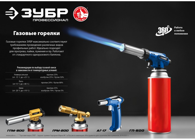 Газовая горелка Зубр Профессионал АГ-17 автономная с пьезоподжигом, 1300°С [55518]