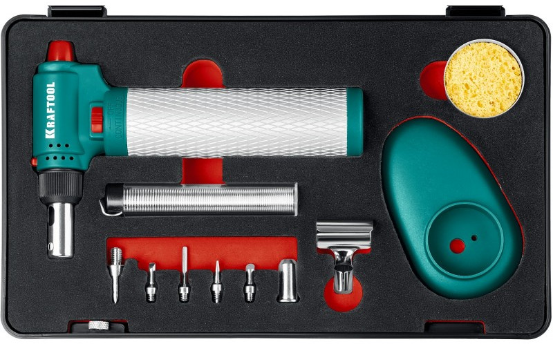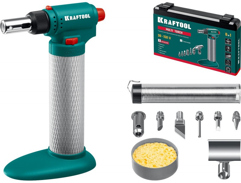 Газовый паяльник KRAFTOOL Multi torch 30 - 150 Вт 1300°С, набор 8 в 1: горелка, фен, пьезоподжиг [55506-H8]
