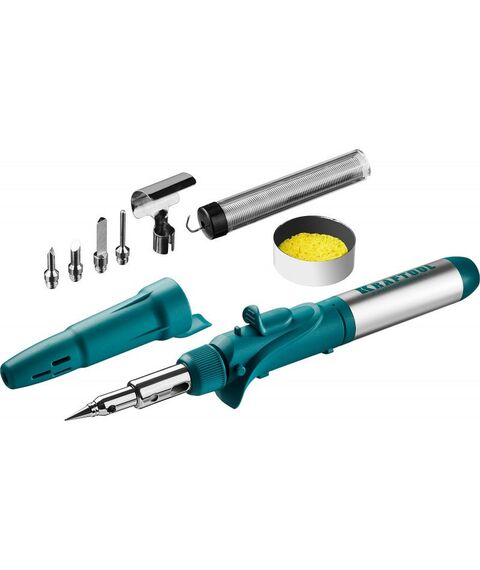 Газовый паяльник KRAFTOOL SolderPro 120K набор 10-в-1, 30-120 Вт, горелка, фен, пьезоподжиг, 1300°С [55503-H10]
