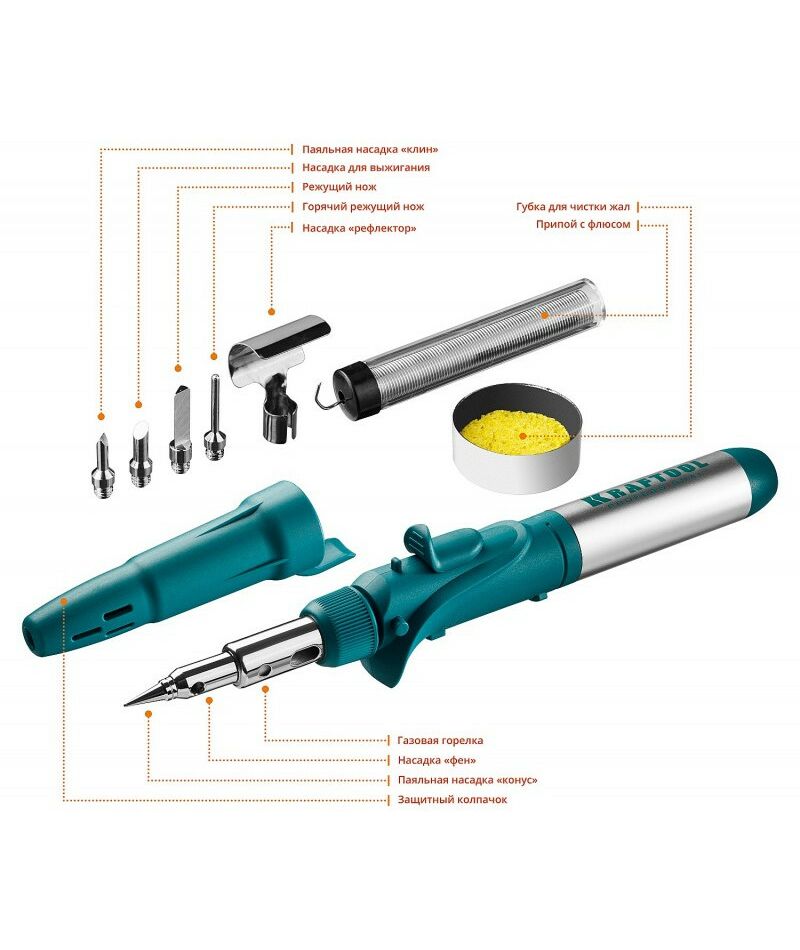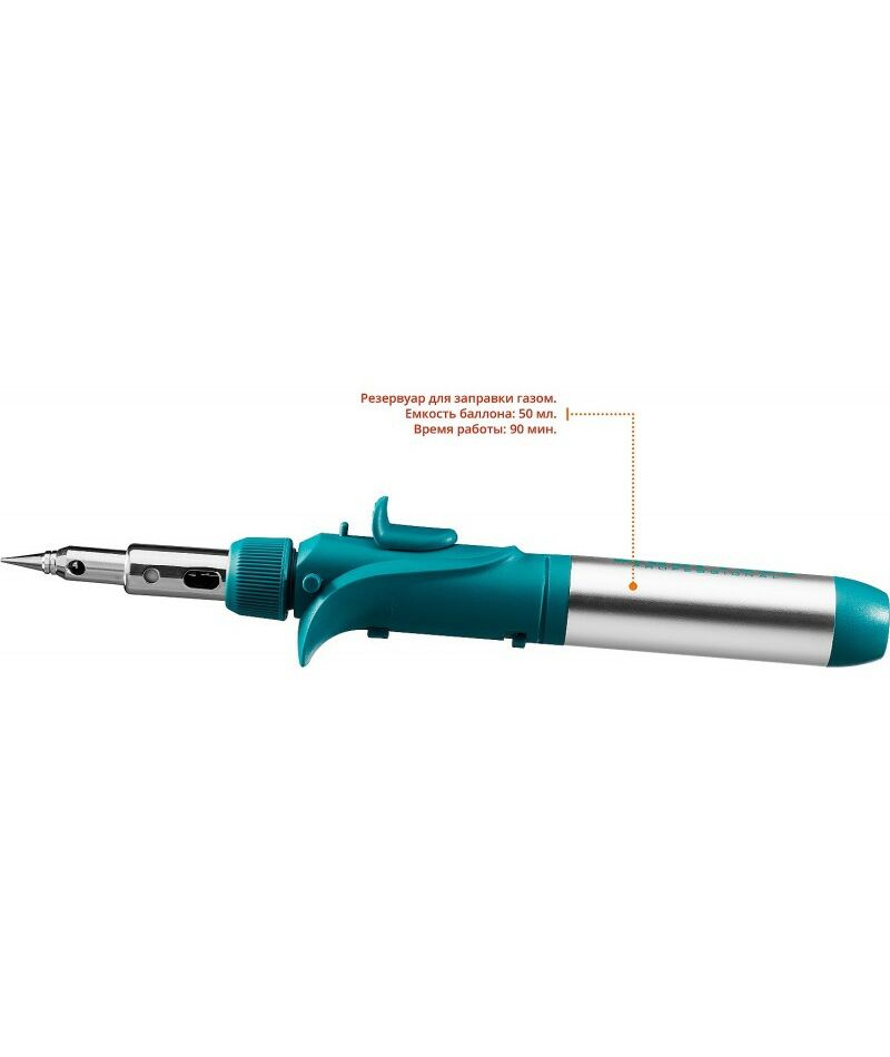 Газовый паяльник представляет собой горелку с набором насадок. Предназначен для плавки и сварки пластиковых частей, нагрева малых металлических частей и плавки металла с низкой температурой плавления, ремонта ювелирных изделий, сгибания тонких стеклянных трубок, пайки медных трубок, сварки электронных и электротехнических элементов, где очень важна точность и надежность. Изделие обладает возможностью выбора температурного режима, что позволяет максимально соответствовать требованиям любой работы. Этот легкий в обращении инструмент, работающий на бутане. Универсальная горелка имеет встроенный клапан для заправки. Заправляется от баллона с бутаном для газовых зажигалок. Создает устойчивое пламя температурой до 1300 °С.