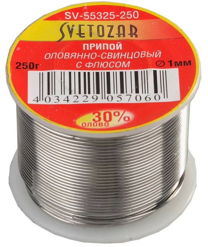- Припой оловянно-свинцовый СВЕТОЗАР – высококачественный сплав для пайки и лужения элементов электро- и радиоаппаратуры, печатных схем, точных приборов с высокогерметичными швами, медных проводов максимальная температура нагрева которых не должна превышать 200ºС. Оловянно-свинцовые припои торговой марки СВЕТОЗАР изготовлены из качественных компонентов и обеспечивают надежную пайку.