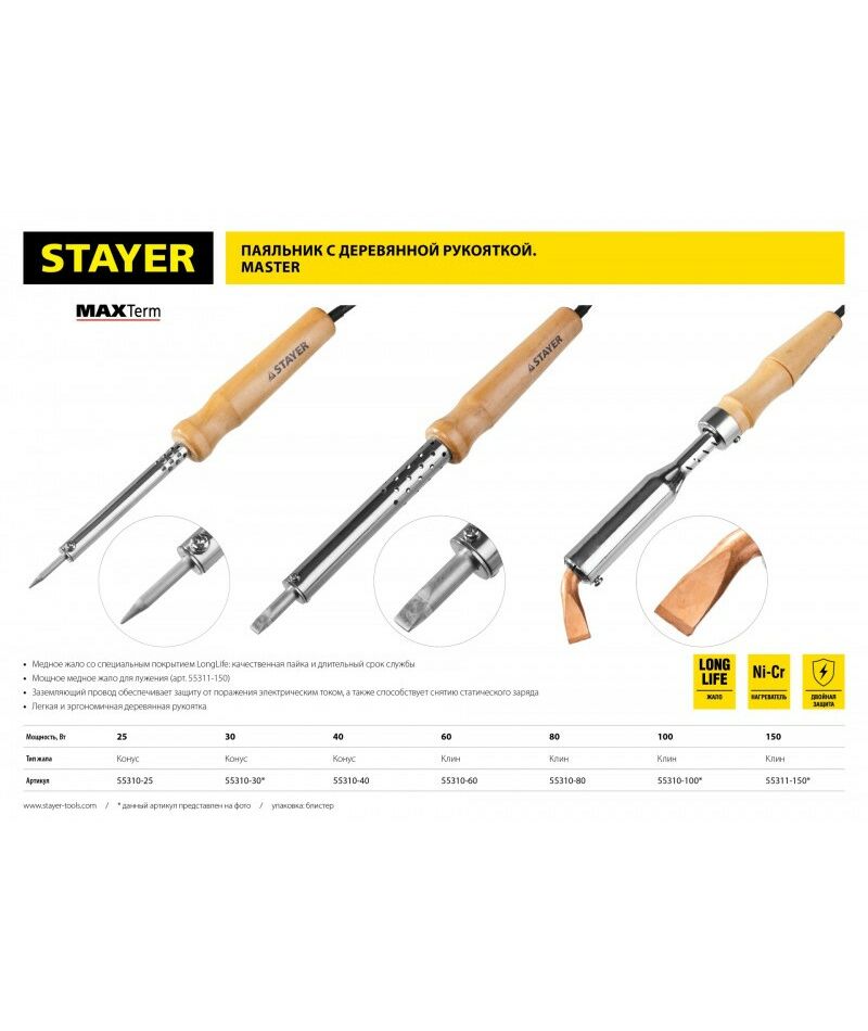 Электропаяльник для лужения STAYER MAXTerm 150 Вт клин, с деревянной рукояткой [55311-150]
