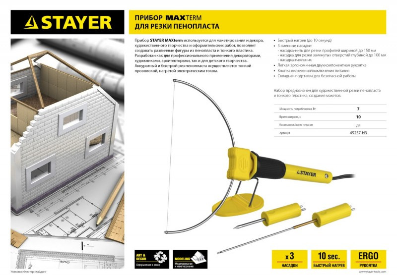 Прибор для художественной резки STAYER MAXterm 7Вт в наборе 3 насадки, аккуратный рез пенопласта+пластика [45257-H3]