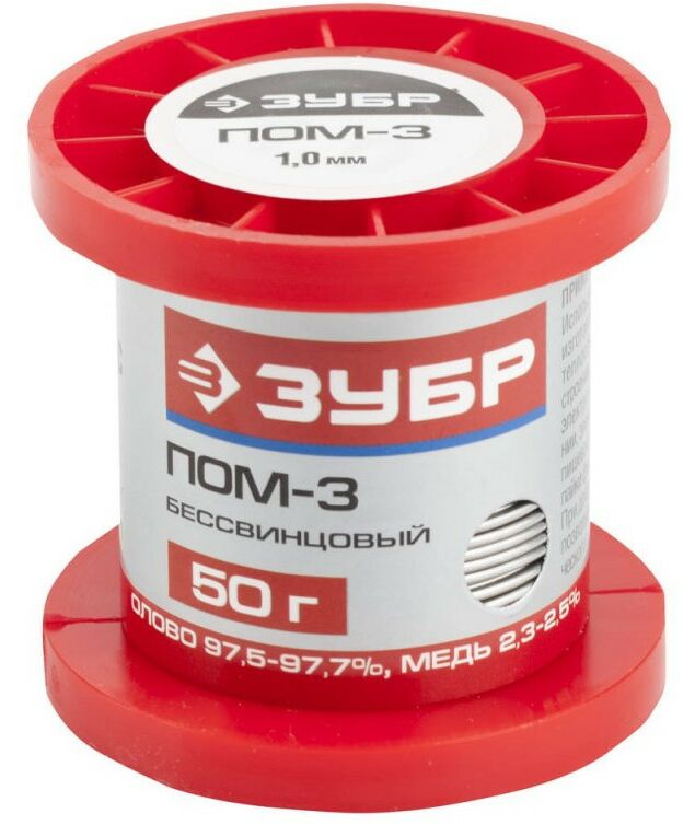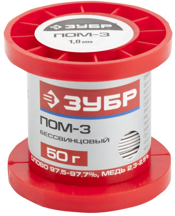 Припой ПОМ-3 Зубр 55456-050-10 применяется для изготовления припойных паст, пайки теплообменников в машиностроении и пайки фитингов медных труб. Содержит 97% олова и 3% меди. Соответствует ГОСТ 21931-76.