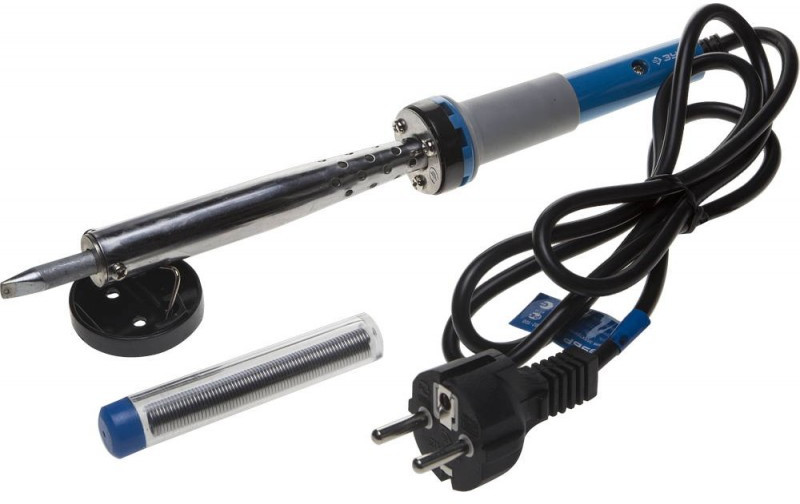 Электропаяльник Зубр Эксперт 100Вт в наборе: припой + подставка, 2-комп. рукоятка, клин, керамический нагреватель [55402-100]